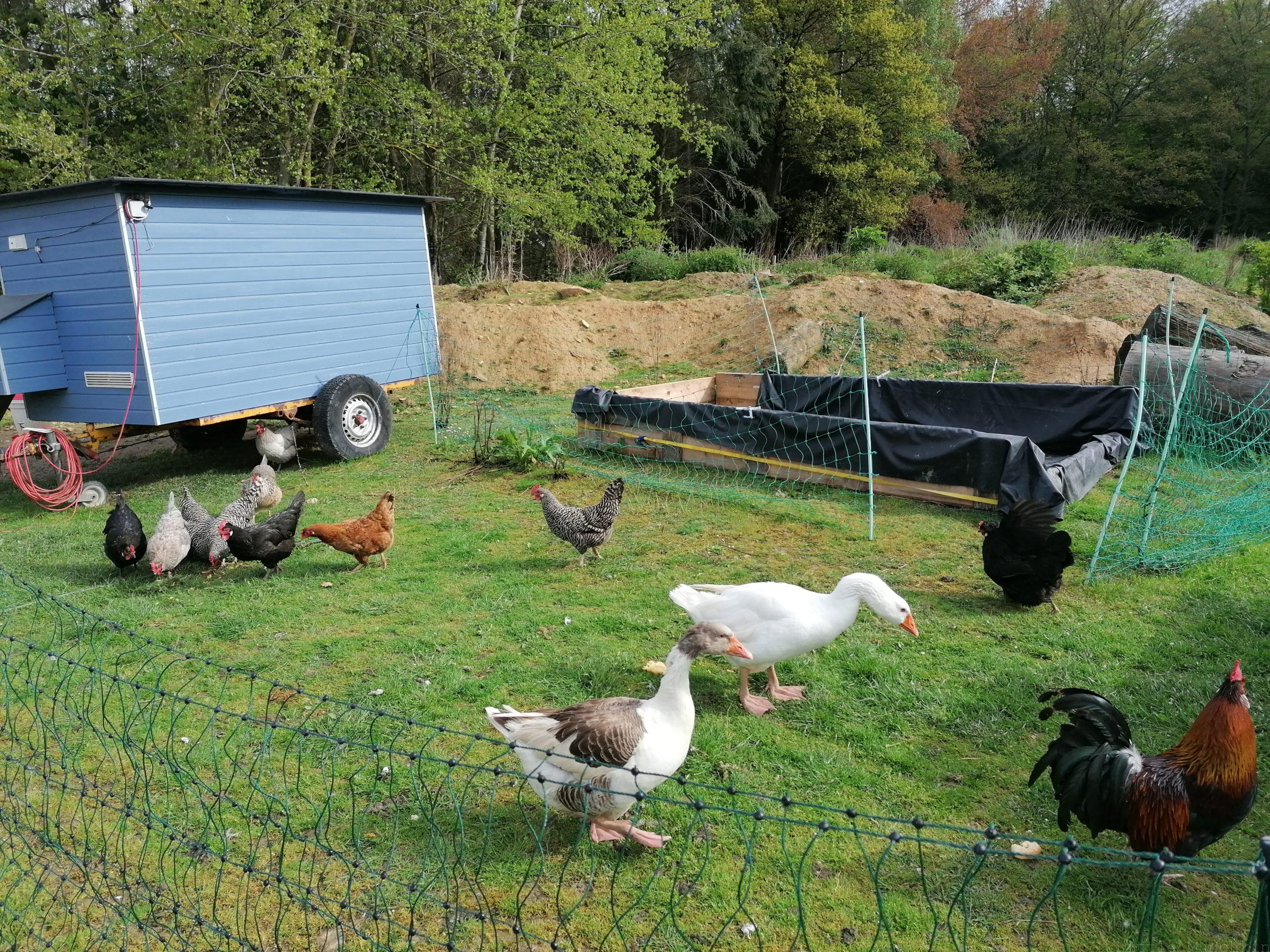 Gleich nebenan hat unser Nachbar Hühner, Gänse, Pferde und Schweine, und demnächst noch Rinder die wir natürlich häufig besuchen.