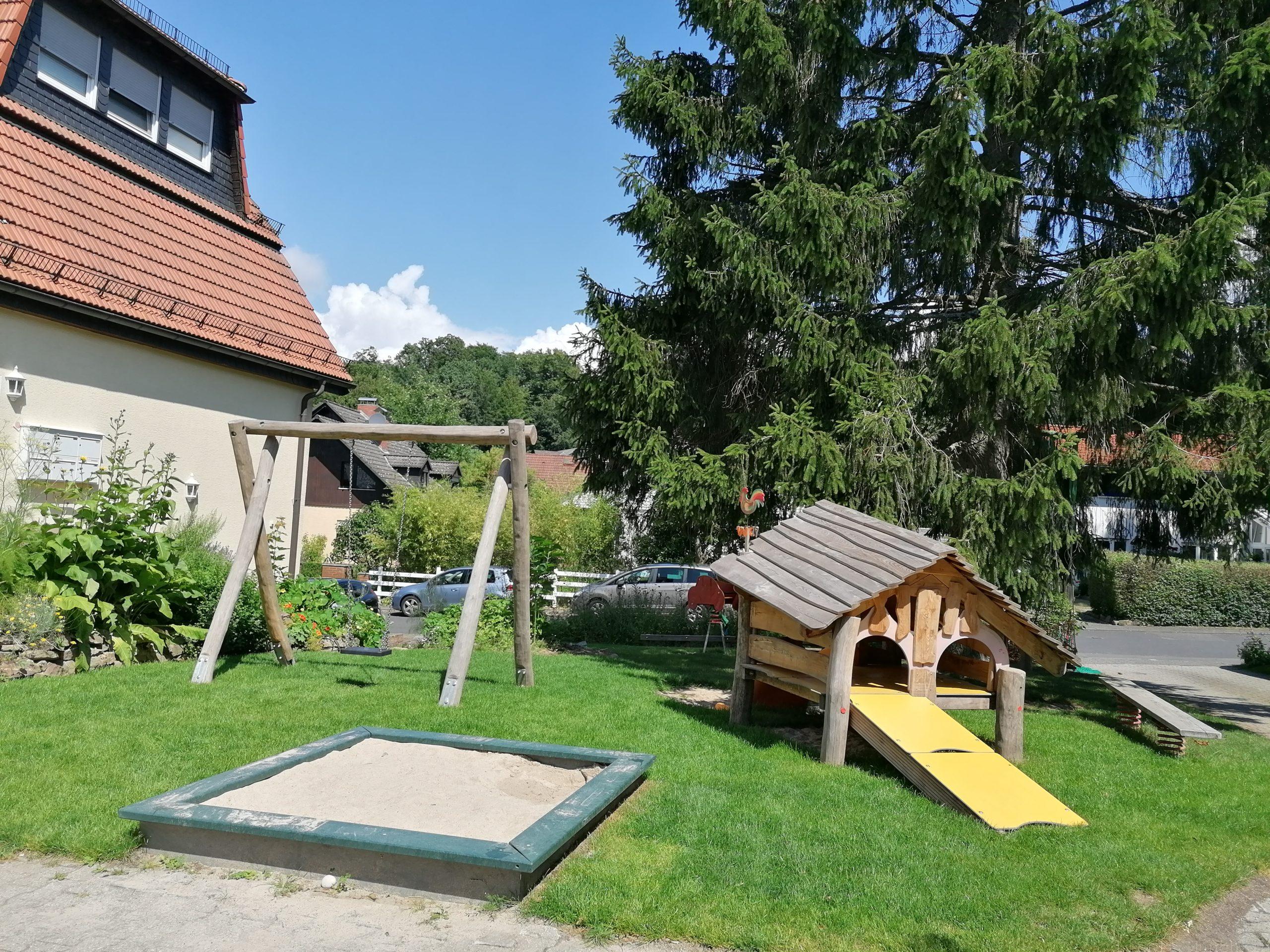Im Garten und Hof können wir Rutsche Auto fahren, im Sandkasten spielen, Schaukeln u.v.m.